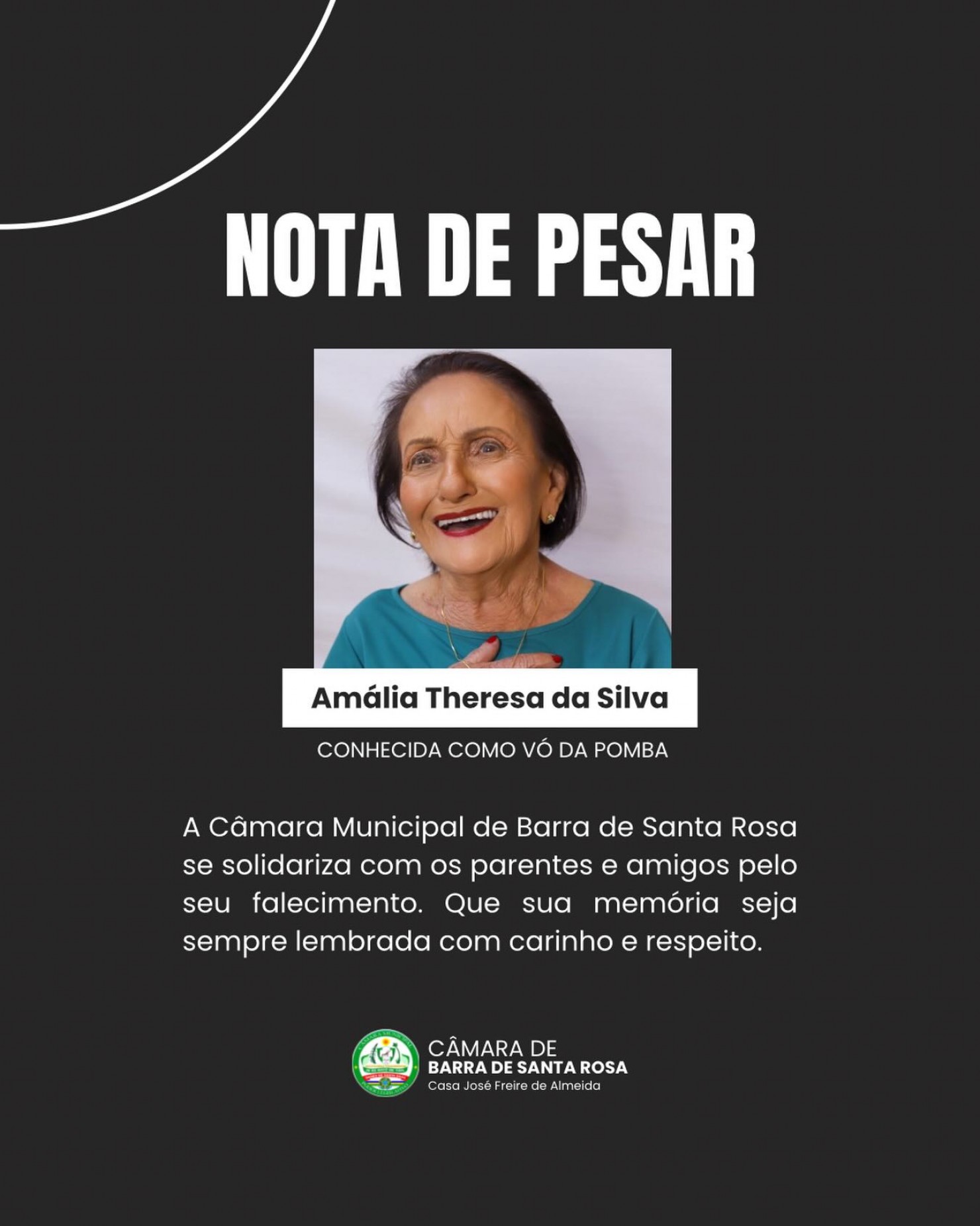 A Câmara Municipal de Barra de Santa Rosa se solidariza com os parentes e amigos pelo seu falecimento.