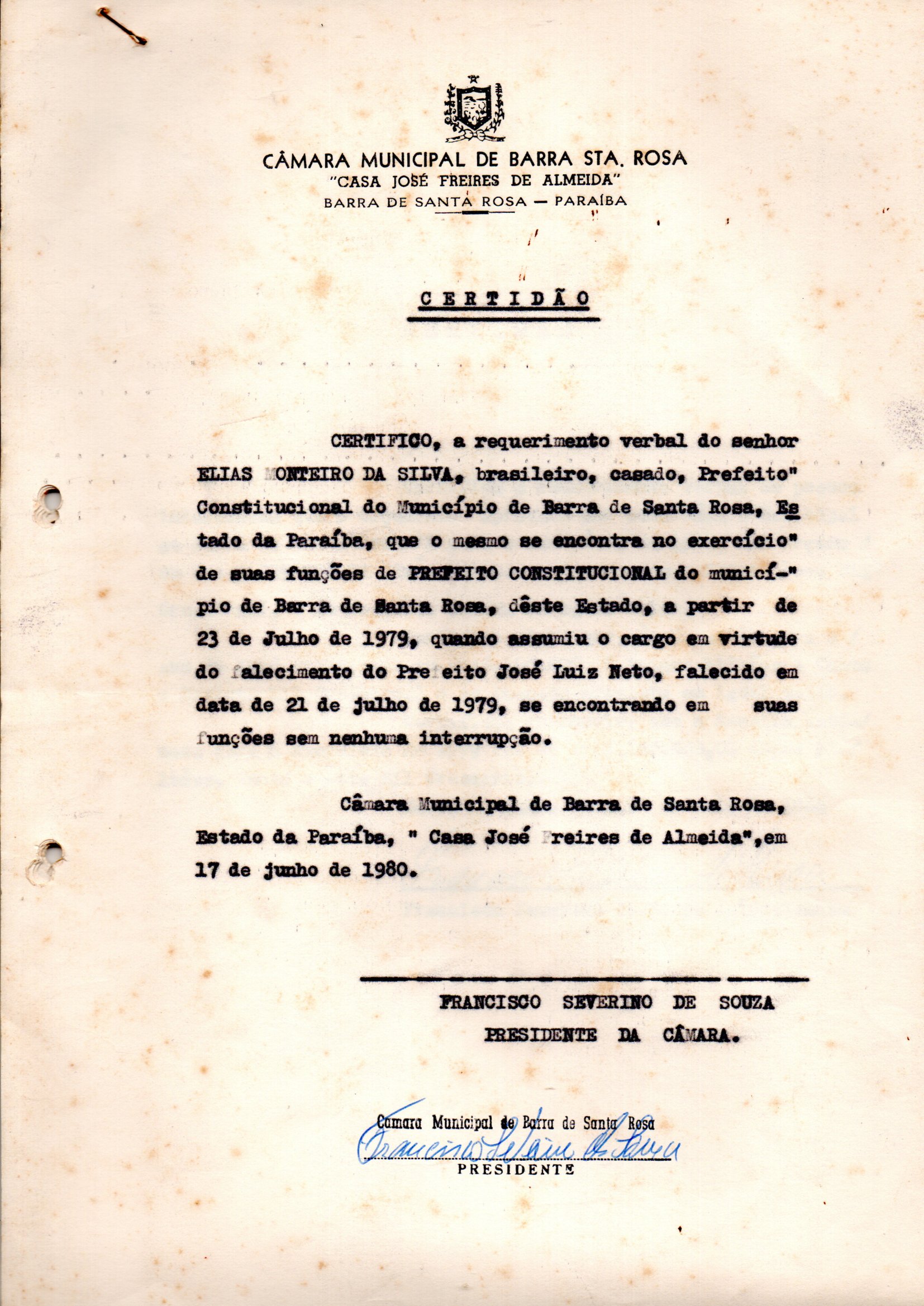 Documento histórico que certifica e valida Elias Monteiro da Silva como prefeito do município de Barra de Santa após o falecimento do então prefeito José Luiz Neto.