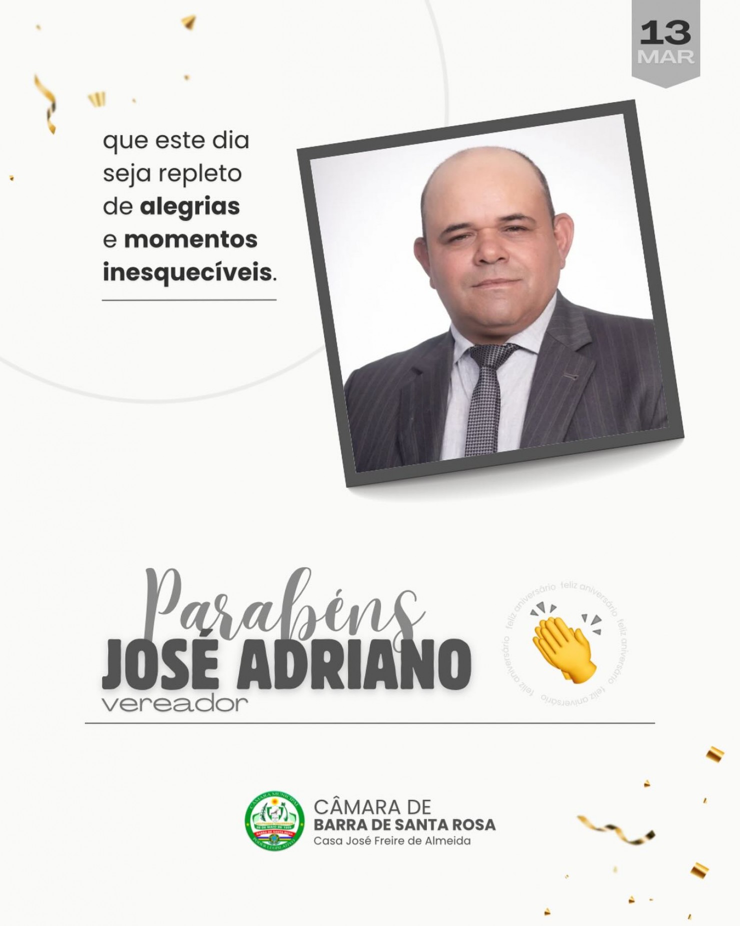 Receba o carinho e homenagem de todos que fazem parte da Câmara Municipal de Barra de Santa Rosa - PB. Parabéns!